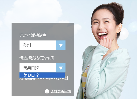 您只要点进【隐适美日链接】,可看到左侧请选择“活动站点”,选定下拉框中的“苏州”,下面对应出现的“站点诊所”有且只有“美奥口腔”一家,并且显示美奥口腔举行的“隐适美日”的时间。